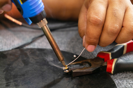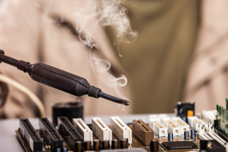 Manual worker human hand holding soldering iron tool repairing computer electronics circuit board