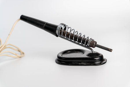 Vintage soldering iron resting on a metal stand