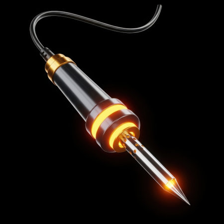 A close-up, dramatic studio shot of a modern soldering iron with a glowing orange heating element against a stark black background.