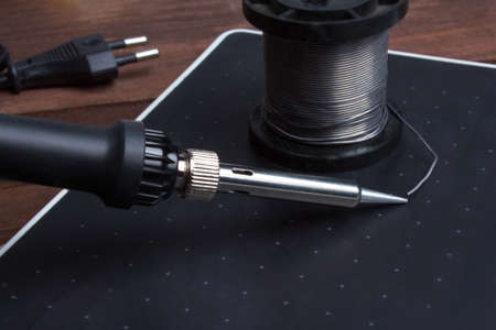 soldering iron solders the electronic components onto the PCB. Electronics repair and digital technology.
