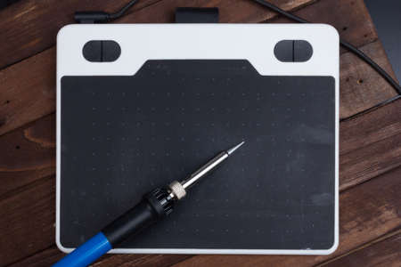 An electric soldering iron lies on a dirty charred board. Industrial electrical equipment or a hobby. Close-up. Selective focus.