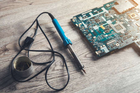 motherboard with soldering iron on the table