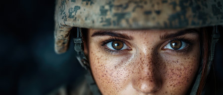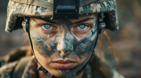 Close-up of a determined female soldier in camouflage face paint and helmet, highlighting her fierce blue eyes and combat readiness.