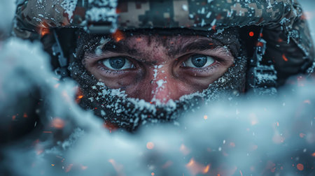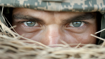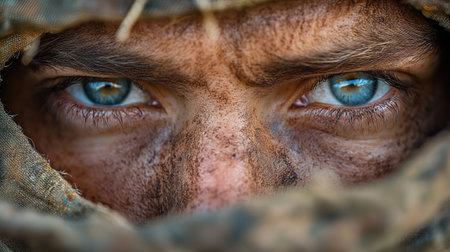 Detailed close-up of a soldier's piercing blue eyes peering through rugged camouflage, evoking a sense of determination, focus, and the harsh realities of tactical field operations.