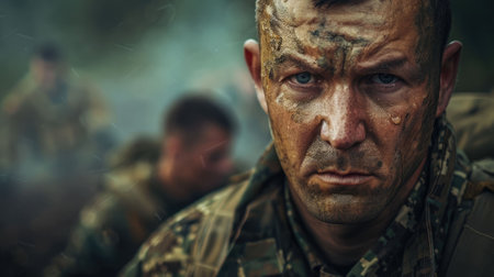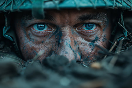 Intense close up of battle weary soldier showcasing profound fatigue and extreme exhaustion