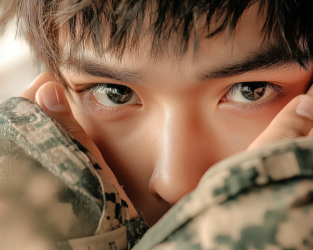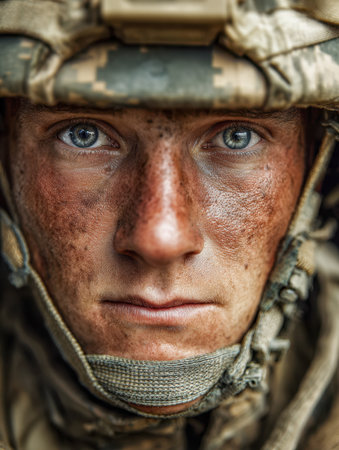 A determined male soldier looks intensely from under his helmet, expressing strength, focus, and unwavering resolve in duty.