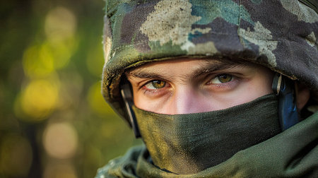 A soldier dressed in camouflage and face mask stars intently, displaying fierce determination in a forest environment during dawn.