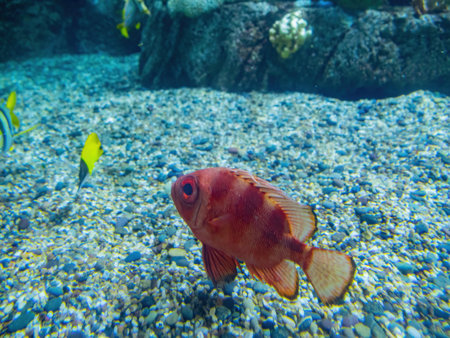 The popeye catalufa fish with large eyes and red body swimming near rocks in a tropical aquarium. Nocturnal marine species in clear underwater scene