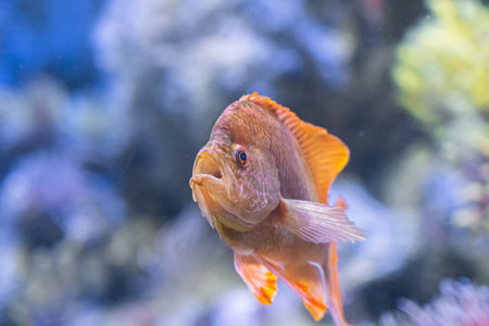 Close up of a red cichlid fish swimming in the ocean