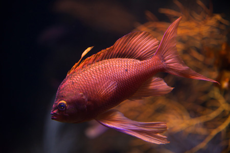 Red fish swimming in the aquarium. Aquarium fish closeup.