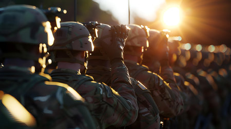 A group of soldiers stands in formation during a sunset ceremony, showcasing their profiles in uniform. The scene emanates discipline, unity, and dedication to service.