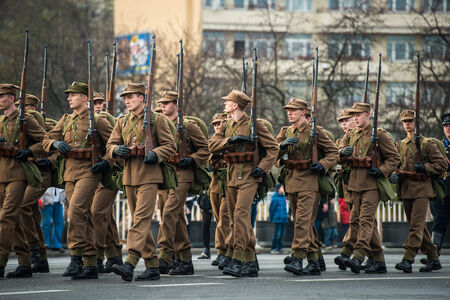 US Army soldiers take part at the Romanian National Day military parade.