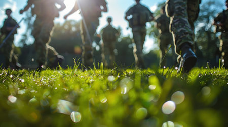 The soldiers' legs are dressed in ankle boots and camouflage pants. Close-up, selective focus.