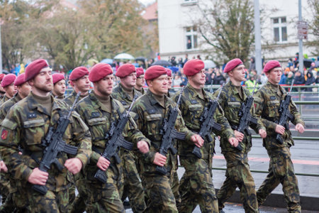 European street, Prague-October 28, 2018: Soldiers of Czech Army are marching on military parade for 100 th anniversary of creation Czechoslovakia on October 28, 2018 in Prague, Czech Republic