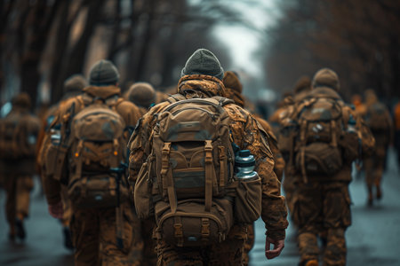 Oviedo, Spain - May, 25, 2024: A lines of paratroopers in camouflage uniforms march in formation, carrying parachutes and equipment. They are preparing for a military mission, showcasing their discipline and readiness