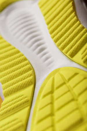 Close-up of the tread of a yellow sneaker, the textured pattern of the sole. Macro