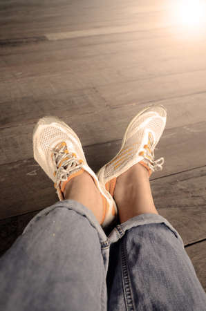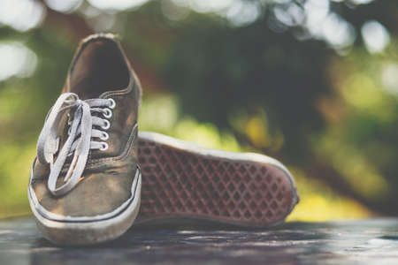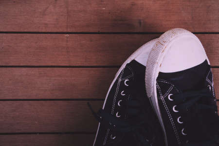 Old worn canvas shoes on a wooden floor Vintage Retro Filter.