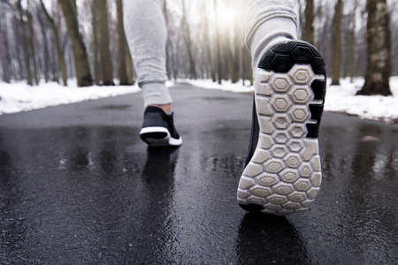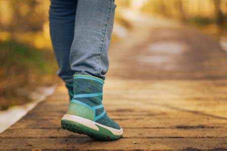 Feet of a runner. Young girl runs in the forest. Close-up of sneakers.