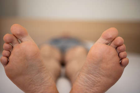 Caucasian man's bare feet laying on a bed, shallow depth of field, unrecognizable face.