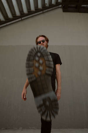 Running and jumping over the camera. Running shoe on sky background, low angle view