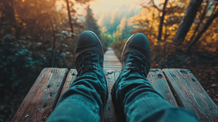 A traveler's perspective of their legs resting on a wooden bench, with a peaceful forest path ahead and warm sunlight filtering through the trees, evoking a sense of adventure and tranquility.