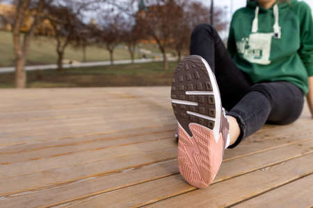 An unrecognizable woman in green sweater and black jeans sits on wooden deck. Women's legs in pink sneakers. Outsole of sports shoes. side view