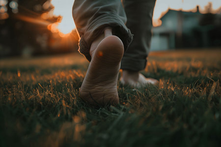 close up of the bare feet of a person walking on the grass, therapy and reduce stress in living and investing and doing business