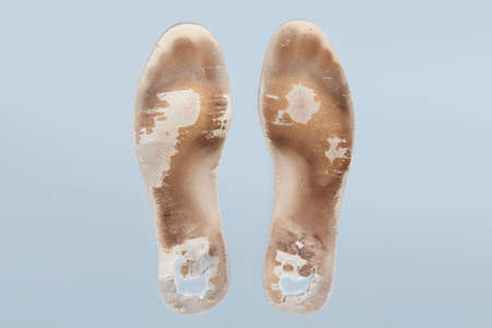 Two old, shabby orthopedic insoles isolated on blue background. Dirty leather insoles. Worn out things with holes. Inner soles of shoes. Top view banner close up.
