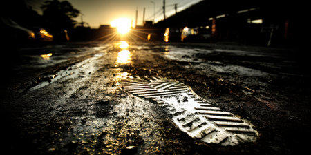 A close-up view of a single footprint on a wet urban ground, reflecting warm sunset light, creating a tranquil yet powerful atmosphere showcasing the journey through life.