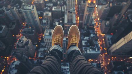 Yellow sneakers and folded jeans hovering above a city illuminated by streetlights during dusk.