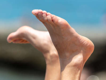Womens feet close-up. A woman lies on her stomach, morning, the rays of the sun.