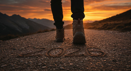 Low-angle view of feet in walking shoes on a dirt path with 2026 drawn in the sand, set against a vibrant orange and yellow sky over silhouetted mountains.