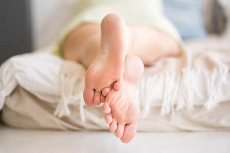 Woman relaxing in bedroom, female feet close-up, foot care concept, home interior