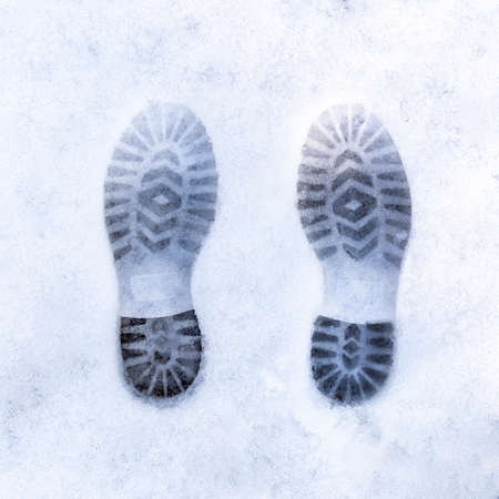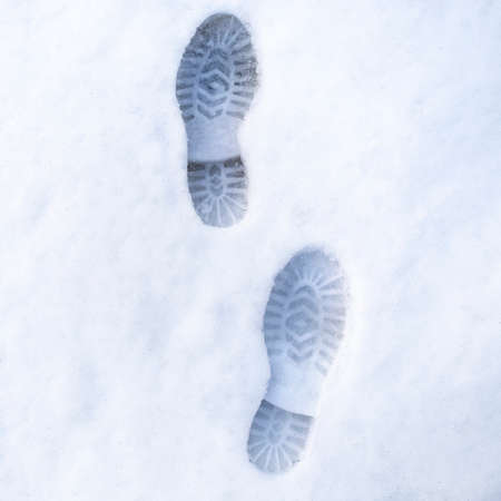 A step against snow background. footprint on white snow background of boots. Human trace on snow.