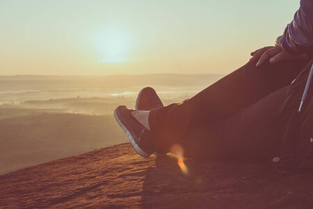 Young woman sitting on peak hill lookup mountain and forest at morning sunlight background. Happy gril relaxing concept.