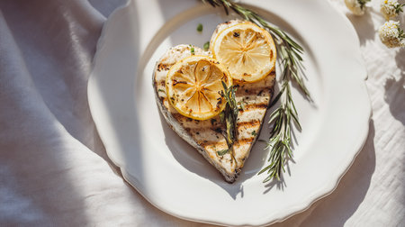 Heart shaped grilled fish fillet or chicken breast with lemon slices and rosemary on a white plate, symbolizing love and healthy diet choices