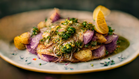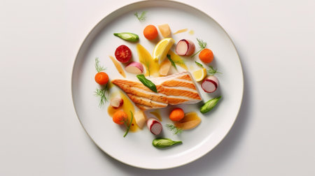 AI Generated. Grilled Fish Plated with Fresh Vegetables and Herbs