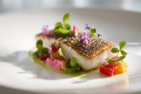 A beautifully presented gourmet fish dish with vibrant vegetables, showcasing culinary artistry in an elegant dining setting, perfect for food enthusiasts.