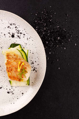 Delicious fillet of grilled and oven baked codfish or coalfish served with thin sliced vegetables and oil sauce, on a white porcelain dish next to golden candles in a warm light of a restaurant, close up view from the top