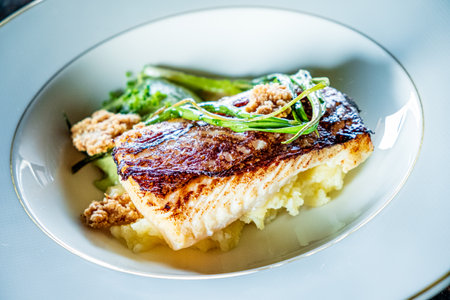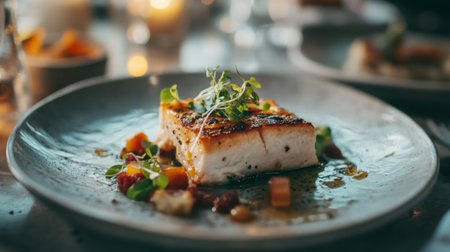 Closeup of a delectable panseared cod dish, garnished and ready to be served at a highend restaurant