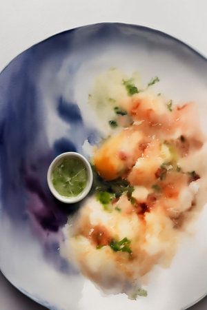 An overhead shot of a delicious fine dining meal on a ceramic plate. The dish is steaming hot and garnished with fresh herbs, set on a rustic table with sauces and a fork.