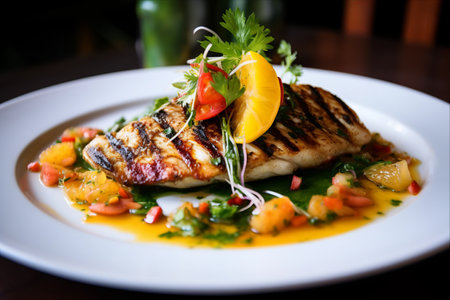 A beautifully presented grilled chicken dish on a plate, garnished with fresh vegetables and herbs. A perfect dining experience for food lovers.