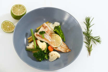 Close up of blue bowl with tasty steamed fish and vegetables with sprig of rosemary on white background. Concept of delicious food with good composition and for emaciation or support body.