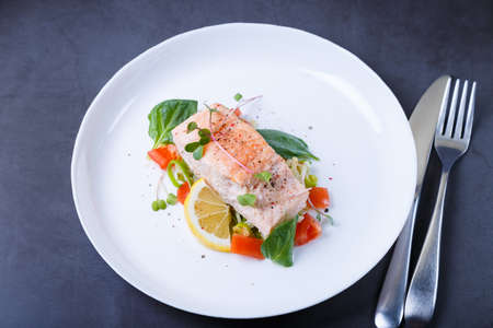 Grilled salmon steak in a bowl. On a dark background. selective focus.