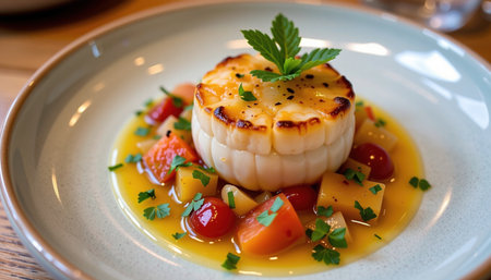 A scallop ceviche with fresh vegetables and herbs, beautifully plated for elegant dining experience