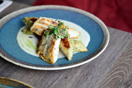 Grilled sea bream fillet with creamy sauce and elegant plating