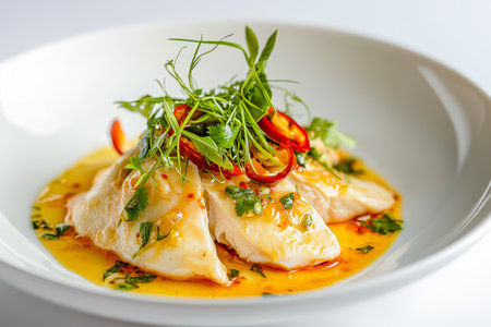 Delicious plate of steamed fish garnished with fresh herbs and chili in a vibrant sauce served at a modern restaurant