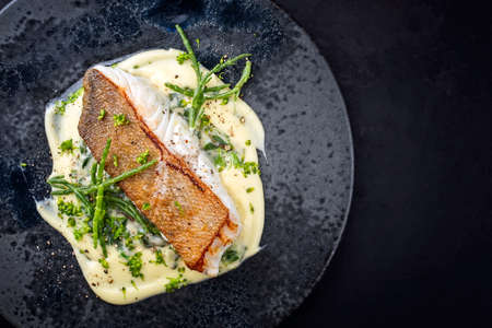 sea bass poele with white wine sauce, luxury restaurant style dish