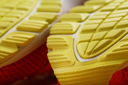 Textured design of the sole of the Tread of a sneaker in yellow Macro. Close-up