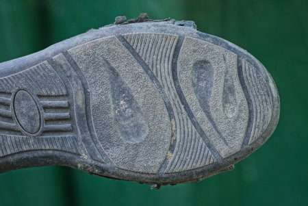 part of the boot with a rubber dirty old sole with a black pattern on a green background